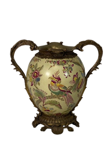 Aqueous floral and bird on aqua vase with heavy brass overlay handles